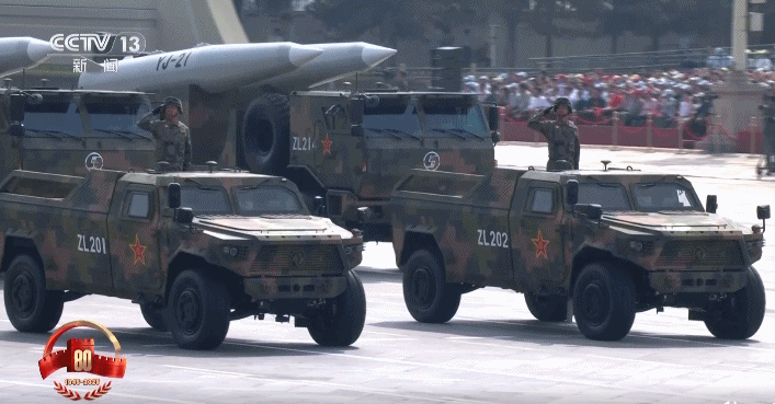 计谋打击群的第二个方队是精熟声速导弹方队,受阅的鹰击-21、东风-17、东风-26D导弹以和洽编组面孔通过天安门,向众东谈主展示大国长剑的尖锐刀锋。